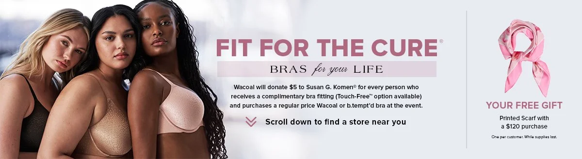 Wacoal will dontate to the Susan Komen Foundation for every person who recieives a complimantary bra fitting. Scan to schedule